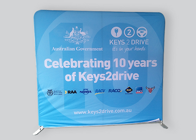 Kiosque avec un fond en tissu 9 oz avec impression par sublimation en couleur (CMYK) avec cadre en tube d'aluminium et étui de transport inclus. Pour usage intérieur seulement.
