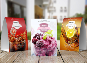 Petite Tente de table imprimé pleines couleurs recto (4/0 CMYK) + vernis aqueux mât sur carton 14 pts C2C avec ligne de scorage et découpe à la matrice. Le produit final est livré à plat, non-assemblé