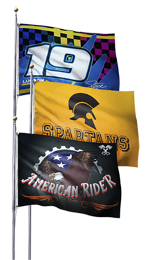 Drapeaux de forme rectangulaire imprimés avec sublimation thermique sur du polyester 3oz et imprimés sur un côté. Les drapeaux simple face afficheront l'image au verso sous forme d'image en miroir avec une visibilité de 70 à 80%.